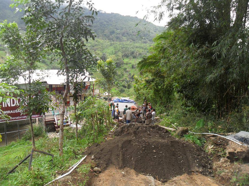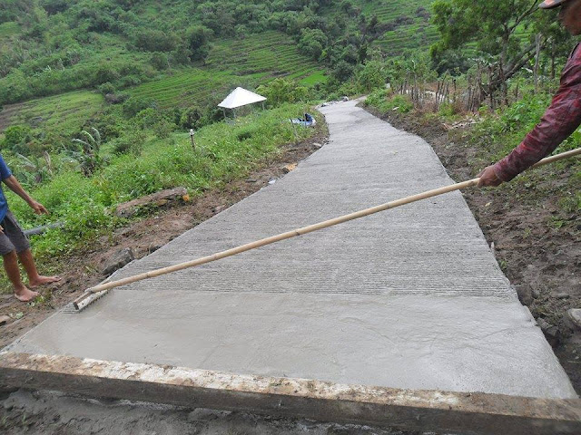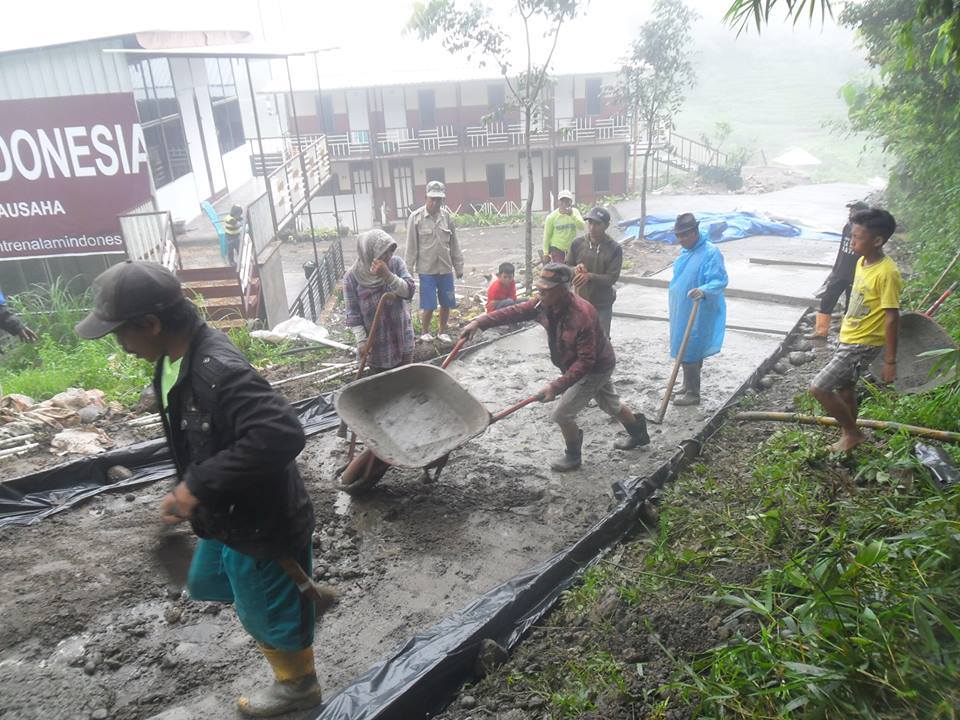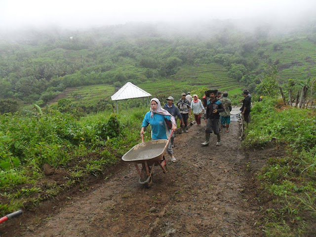 Alhamdulillah dgn dibangunnya jalan pintas ini, maka kendaraan roda empat bisa sampai ke pinggir sawah penduduk. Semua alat pertanian, traktor,pupuk dan gabah dgn mudah diangkut melalui jalan baru tsb. Insya Allah jalan ini akan sangat dirasakan manfaatnya oleh masyarakat, terutama pesantren alam, dan kendaraan tamu pesantren akan leluasa masuk lokasi dan parkir di depan kantor dan penginapan pesantren. Yang sangat saya syukuri adalah bahwa kepedulian masyarakat untuk mengerjakan kepentingan bersama masih sangat kuat. Ini merupakan modal yg sangat besar untuk membagun dari pinggiran. Sayang saya tdk bisa hadir menyaksikan kepolosan, menikmati senda gurau ala “orang dusun” , seandainya aku bisa hadir tentu aku akan menyaksikan pemandangan indah berupa peluh yg bercucuran, semangat membara yg dibalut keikhlasan. Saya hanya mampu membatin kok bisa yah mereka kerja dari pagi sampai sore tanpa komando. Bahkan dari gambar kita bisa melihat ada juga Ibu2 yg ikut mencampur pasir dan mendorong gerobak.