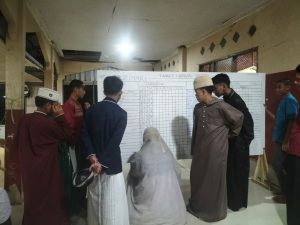 Potret yang tertangkap menunjukkan dinamika khas pesantren, beberapa siswa tampak berdiskusi di depan papan progres, sementara yang lain menunggu giliran dengan sabar. Ada semacam kompetisi positif yang terbangun—bukan untuk saling menjatuhkan, melainkan untuk saling memacu dalam kebaikan (fastabiqul khairat).